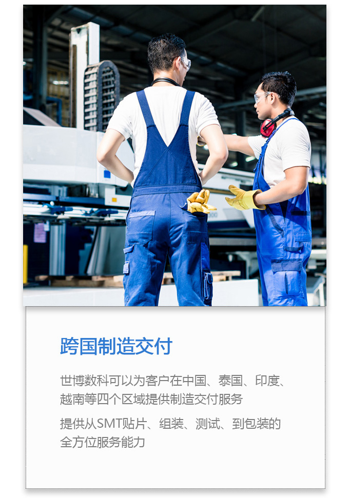 世博数科有SMT贴片、组装、测试、到包装的全方位服务能力,可为企业提供多地域的制造服务。